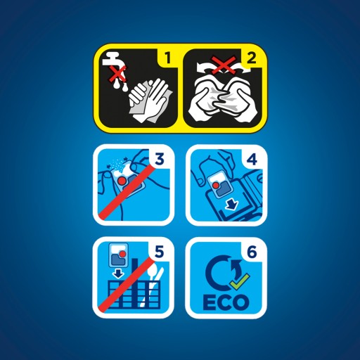 Kapsułka, w rozpuszczalnej folii, łatwa w użyciu, usuwa wszystkie rodzaje pozostałości jedzenia. Za każdym razem, od pierwszego użycia