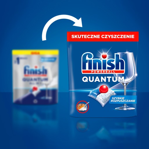 Finish Quantum to intensywne czyszczenie i diamentowy standard blasku Twoich sztućców i naczyń. Nawet bez wstępnego spłukiwania przed włożeniem do zmywarki osiągniesz perfekcyjne rezultaty zmywania.