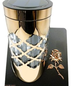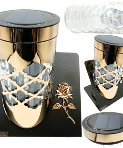 Znicz o prostej formie szkła koloru białego. Zawiera dekielek w kolorze złotym, który chroni płomień przed wiatrem lub deszczem.